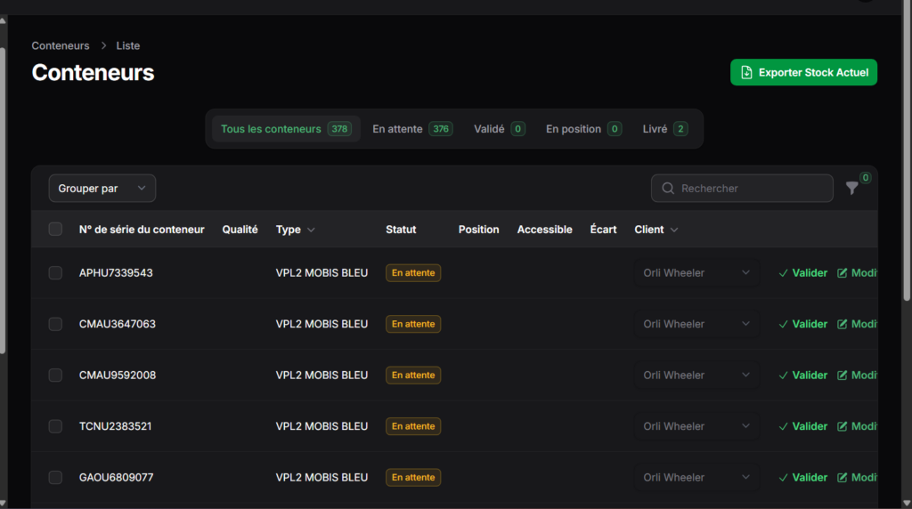 XYZ grid management: We implemented a visual grid system that allows operators to assign and move containers digitally, providing full traceability of every container’s physical location.
