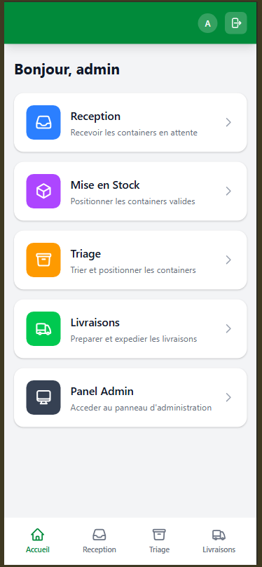 The mobile interface focuses on the main field operations, such as “stock placement” and “positioning.” However, for flexibility and centralized management, all these same operations like : Stock placement and positionning can also be performed from the admin dashboard.