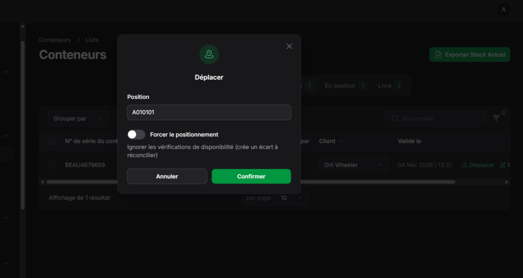 Manual transfer logic: Crucially, the system tracks manual relocations between stock zones. If a container is moved by a forklift, the digital record moves with it, maintaining a complete movement history.
